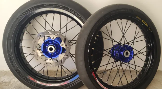 Detalles del productoJuego de ruedas supermotard con llantas negras y bujes azules.