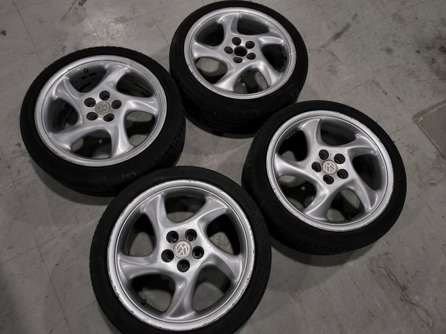 Detalles del productoJuego de 4 llantas de aleación tornillería 4x100 et 35 de 18 pulgadas para Volkswagen, con un diseño inspirado en Porsche. Los neumáticos están mal.Estaban montadas en un golf 4 son muy anchas validas para Seat Ibiza Córdoba León Toledo Volkswagen golf 3 golf 4 bora Skoda Fabià Octavia Audi A2 A3....550€