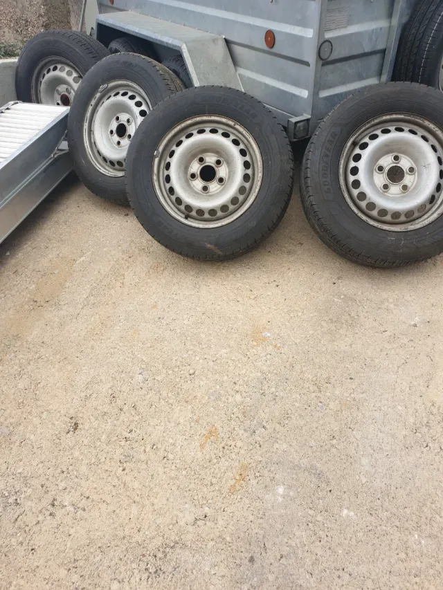 Conjunto de cinco llantas y ruedas Goodyear. - Llantas de acero. - Neumáticos en buen estado.