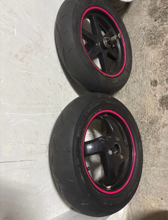 Juego de llantas para yamaha Aerox con neumaticos semislick. - Diseño deportivo. - Borde de color rosa.