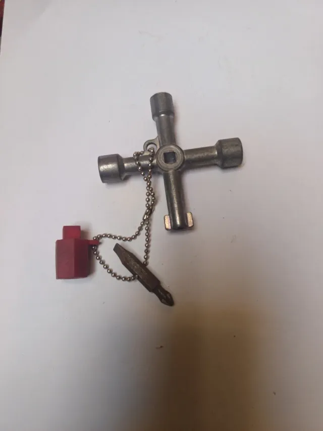 Herramienta versátil para cuadros eléctricos y contadores. - Diseño de cuatro puntas. - Incluye cadena y accesorios.