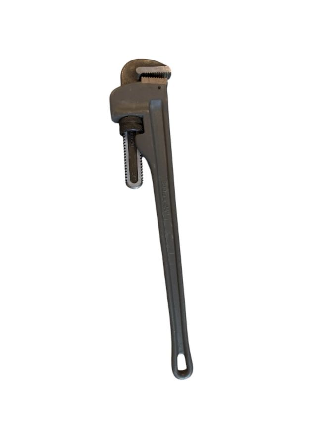 Llave de fontanería de gran tamaño, completamente nueva y sin uso. - Color gris. - Diseño robusto.