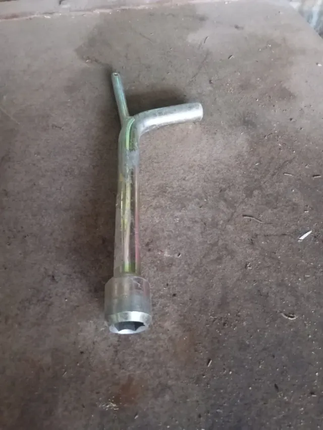 Llave de tornillos de rueda resistente. - Fabricada en metal. - Diseño en forma de L con un extremo para la tuerca.
