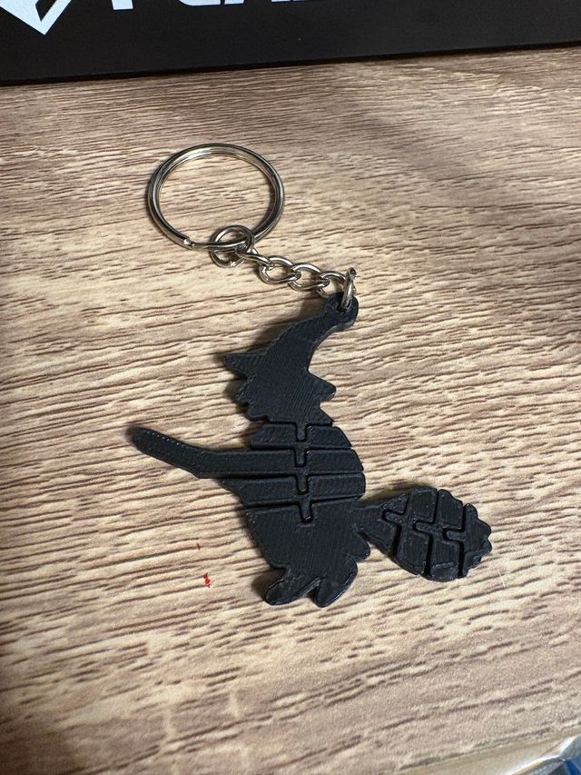Llavero con diseño de bruja volando en escoba, fabricado en impresión 3D. - Color negro. - Diseño detallado de bruja y escoba.