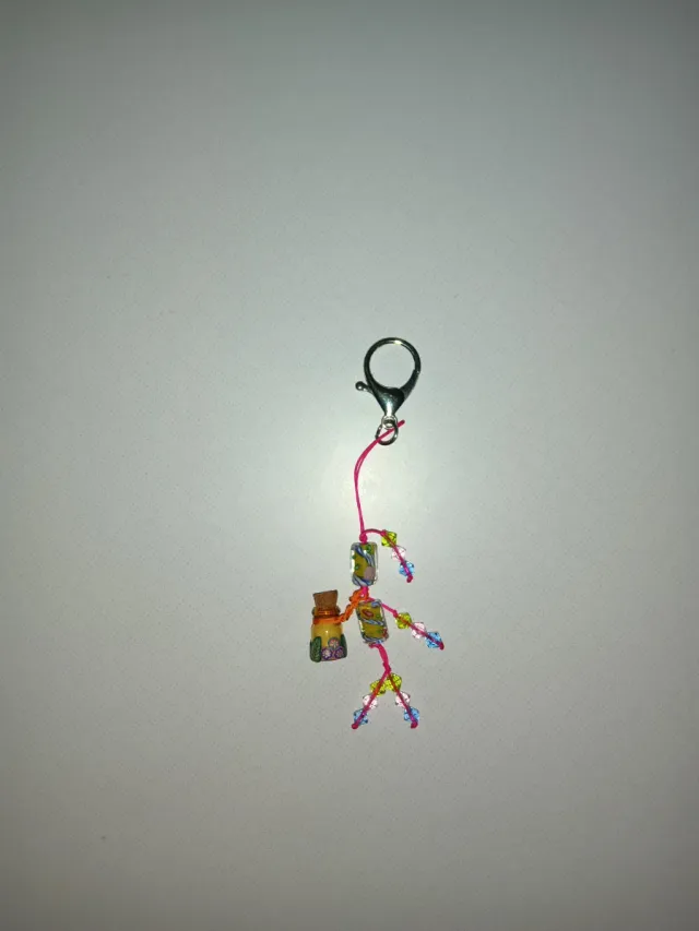 Llavero artesanal con un diseño único. - Incluye una pequeña botellita decorada. - Adornado con abalorios de colores. - Cierre de mosquetón metálico.