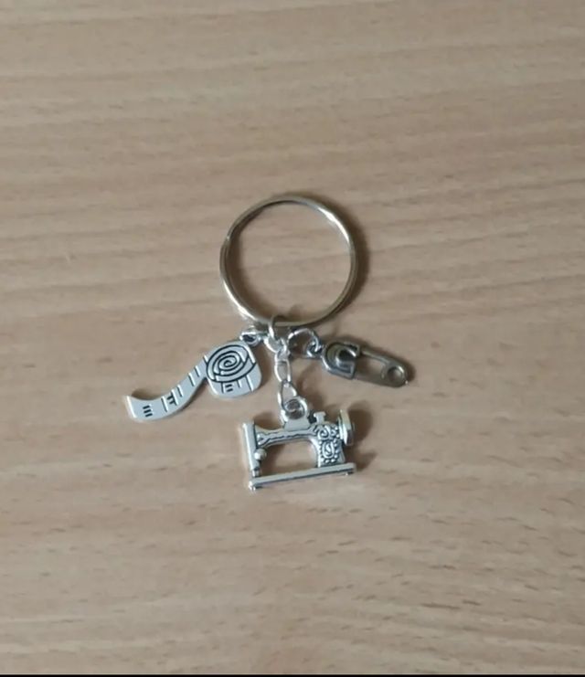 Detalles del productoLlavero con colgantes de costura: imperdible, máquina de coser y cinta de medir.