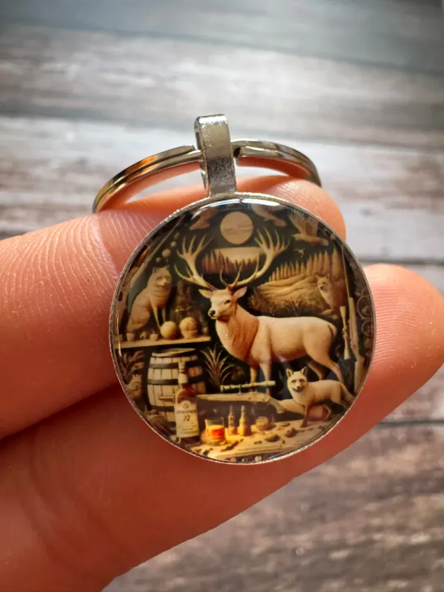 Detalles del productoLlavero de caza detallado. Diseño con ciervo y zorros.