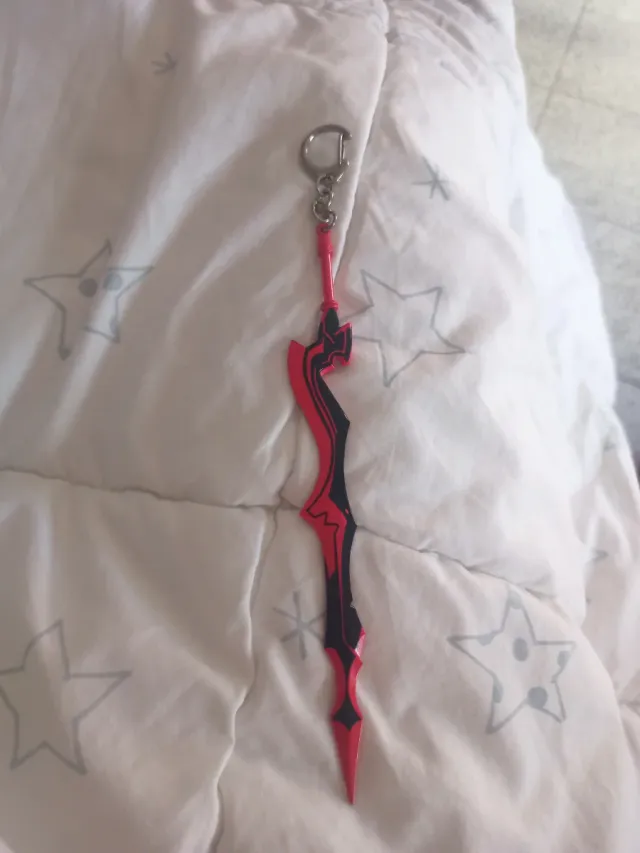 Llavero con diseño de espada de fantasía. - Colores: rojo y negro.