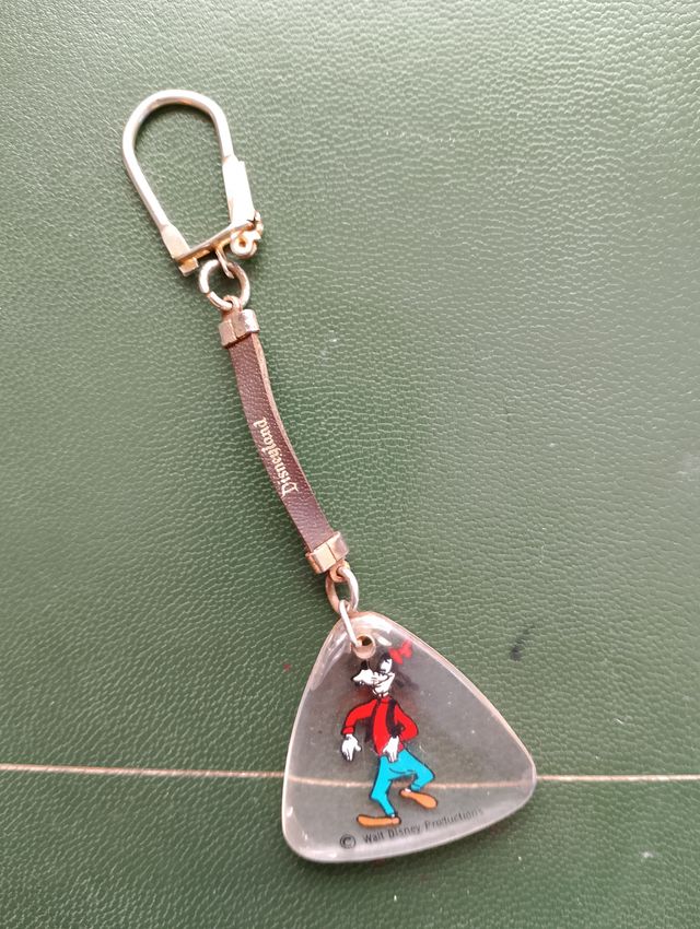 Detalles del productoLlavero vintage de Goofy de Disneyland, con un diseño triangular y correa de cuero. Original de los años 60-70. El dibujo se ve por las dos caras.