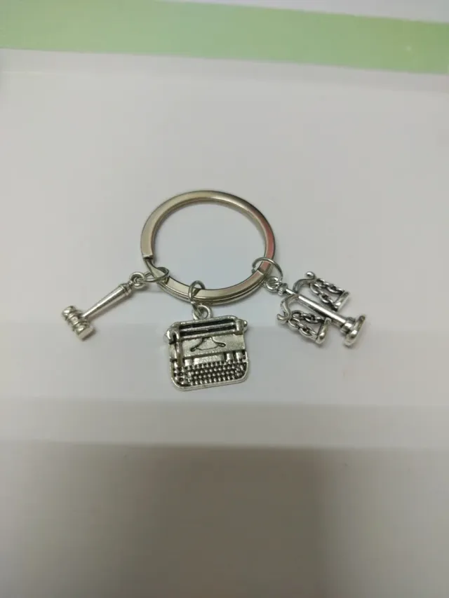 Detalles del productoLlavero con tres dijes: un martillo de juez, una máquina de escribir antigua y una balanza de la justicia. Ideal para profesionales del derecho o amantes de la escritura.