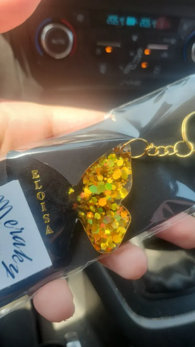 Detalles del productoLlavero artesanal con forma de mariposa, hecho de resina y relleno de brillantina dorada y verde.