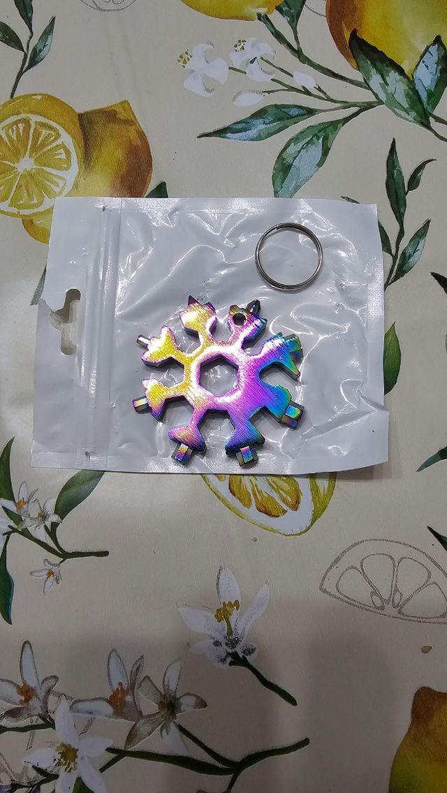 Detalles del productoEste llavero multiherramienta tiene un diseño único en forma de copo de nieve con un acabado iridiscente que cambia de color.