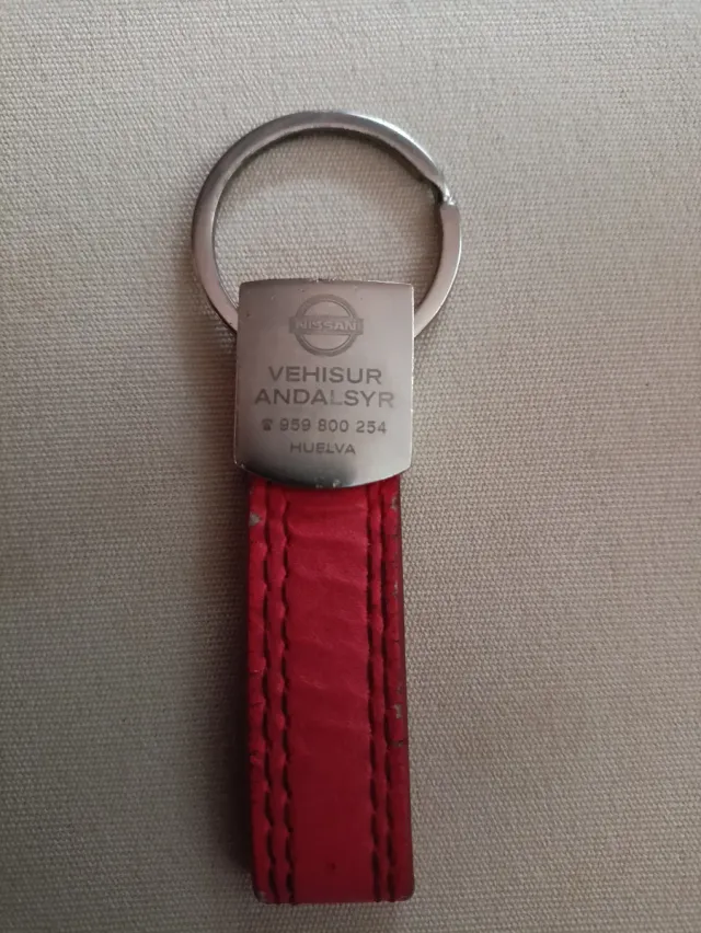 Llavero de la marca Nissan - Diseño con placa metálica y tira de cuero roja. - Grabado del logo de Nissan.