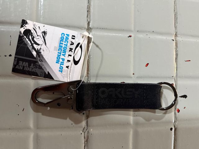 Llavero de la colección Factory Pilot de Oakley. - Diseño con mosquetón y anilla. - Correa de tela negra con logo en relieve.