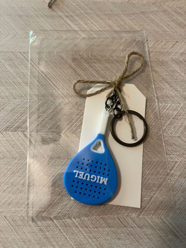 Detalles del productoLlavero con diseño de pala de pádel personalizada con el nombre MIGUEL.