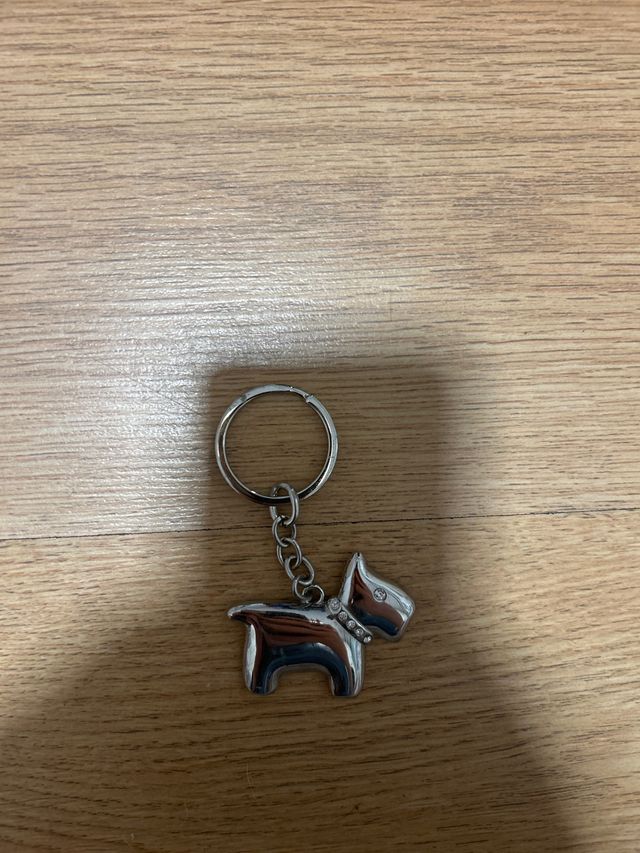 Detalles del productoLlavero con un diseño de perro plateado. El collar del perro está adornado con pequeños brillantes.