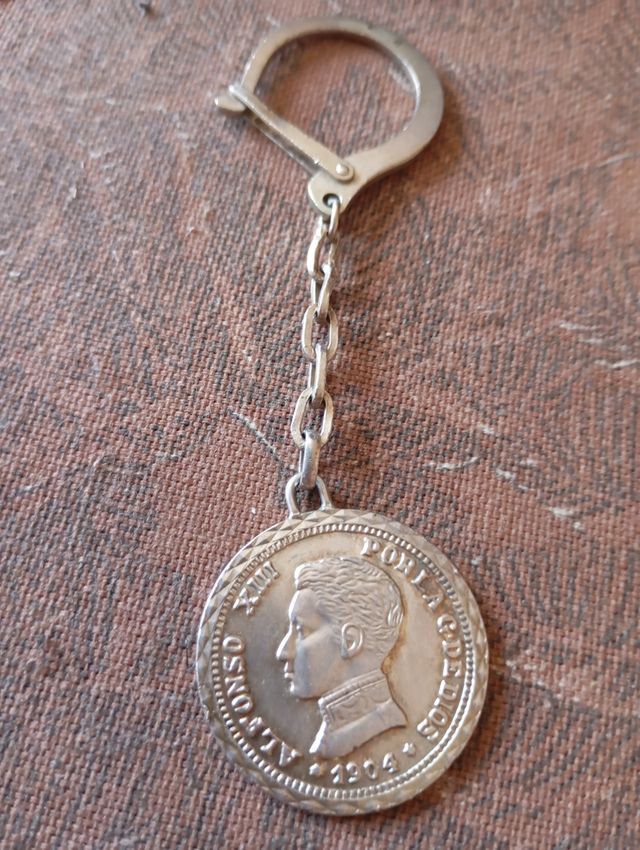 Detalles del productoPreciosa pieza de colección. Se trata de un llavero antiguo con una moneda conmemorativa del rey Alfonso XIII de principios del siglo XX. - Material: Plata. - Diseño: Moneda conmemorativa. - Estado: En buen estado de conservación, considerando su antigüedad.