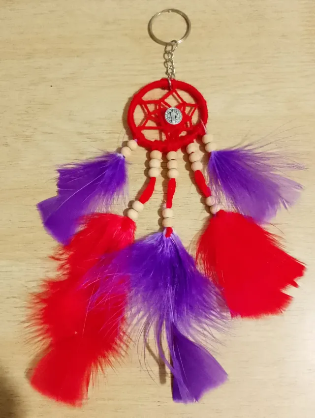 - Plumas rojas y moradas.