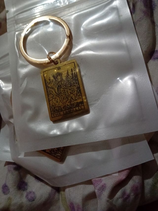 Detalles del productoLlavero dorado con diseño de la carta del Tarot "La Emperatriz". Es un artículo nuevo, sin usar.