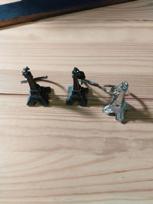 Tres llaveros de la torre Eiffel. Nunca usado. Comprados en Paris. De latón. Uno, acabado cromado, dos acabado bronce antiguo