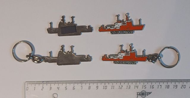 Se venden dos llaveros y dos imanes con forma de barco BIO Hesperides. Son de metal, con detalles en color rojo y blanco. 3 euros la unidad