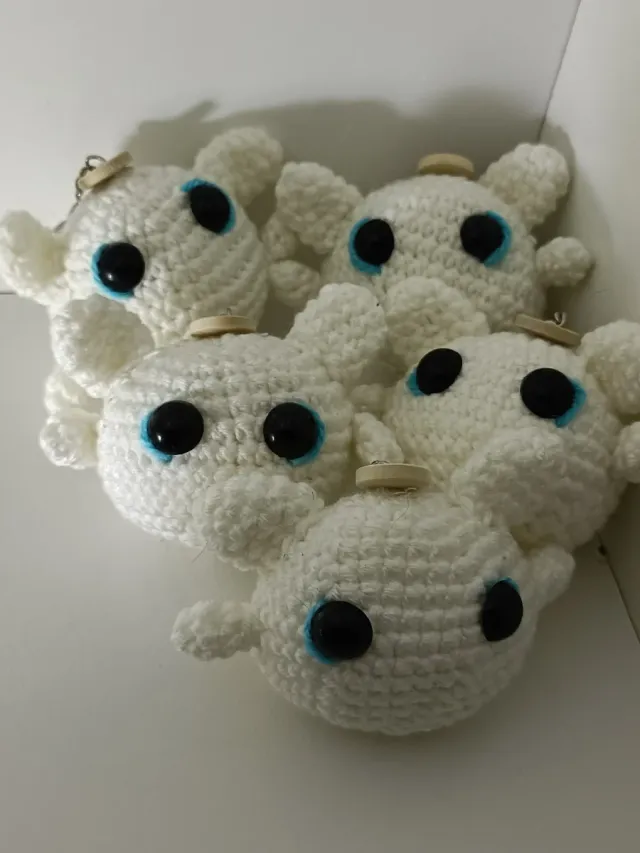 Conjunto de llaveros hechos a mano con forma de Furia Luminosa. - Material de crochet blanco. - Ojos negros con detalles azules. - Adorno de madera en la parte superior.