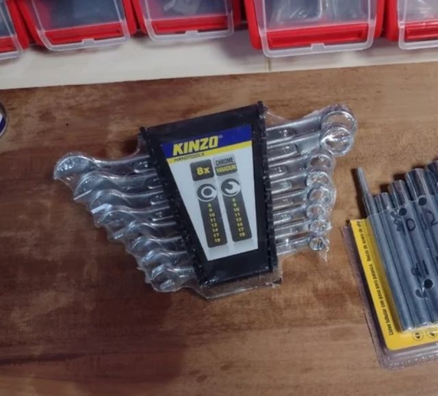 Detalles del producto-Juego de llaves combinadas de ocho piezas: 8mm, 9mm, 10mm, 11mm, 13mm, 14mma, 17mm y 19mm con soporte de plástico para colgar en pared o banco trabajo.