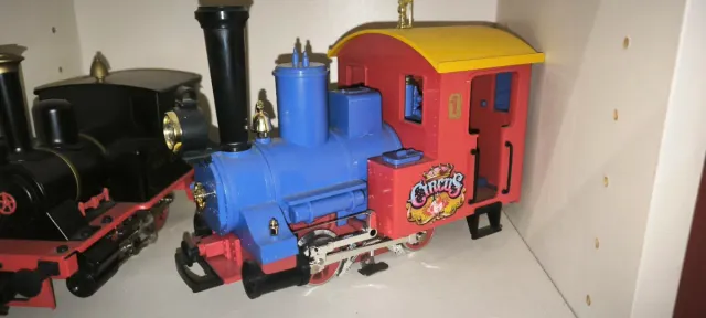 Locomotora de juguete LGB, con detalles de circo y número 1. - Locomotora azul y roja. - Techo amarillo. - Decoración de circo en el lateral.