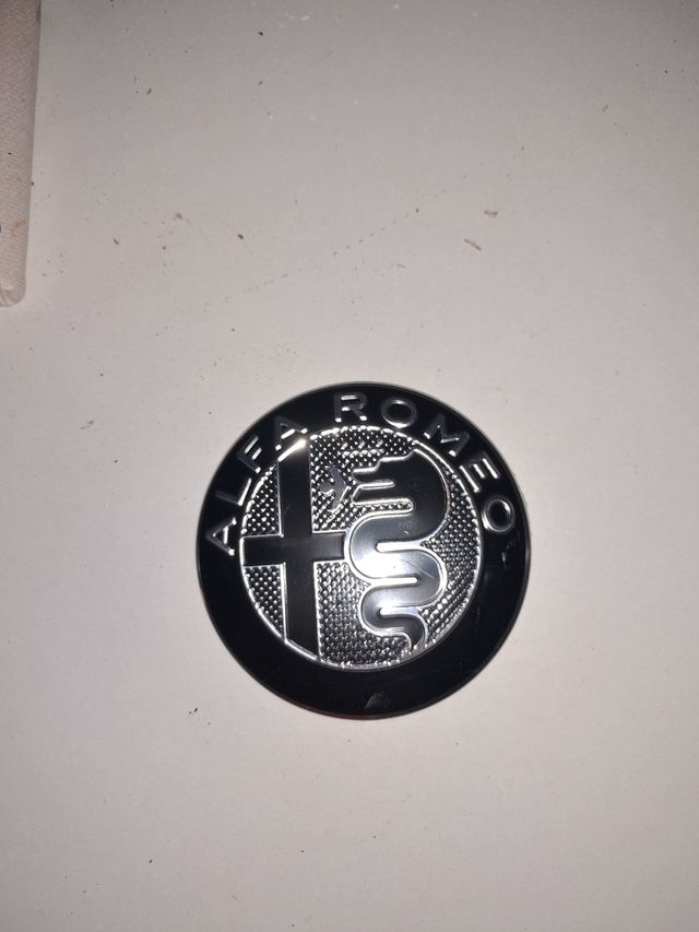 Detalles del productoEmblema de Alfa Romeo para el capó. Es un logo de color negro con detalles plateados. Se encuentra en buen estado.