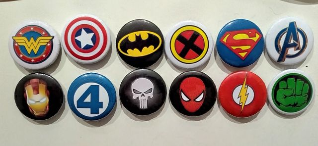 ¡Atención, fans de los comics de superhéroes! Chapas con los logos de Batman, Superman, Flash, Punisher, Capitán América, Spiderman, Hulk, Vengadores, Wonder Woman, Iron Man, 4 Fantásticos, X Men. Perfectas para personalizar mochilas, bolsos o ropa. También son un regalo original y significativo para cualquier amante de los cómics. EL PRECIO ES POR TODO EL LOTE. Medidas del producto