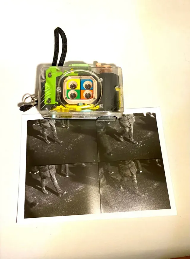 Detalles del productoCámara Lomography Action Sampler con diseño transparente y lentes múltiples.