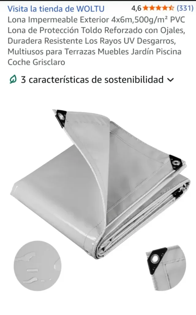Detalles del productoLona impermeable de exterior de 4x6 metros en color gris claro. Fabricada en PVC de 500g/m² y reforzada con ojales.