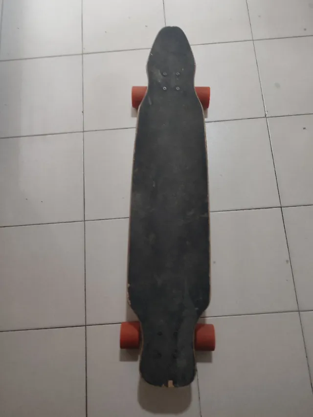 Longboard con un diseño alargado y ruedas de color naranjas.