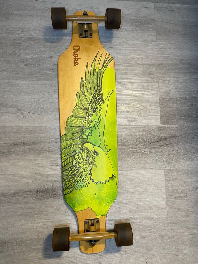 Longboard de calidad con un diseño llamativo de águila en tonos verdes y amarillos. - Tabla de madera clara. - Lija clara. - Marca: Choke.
