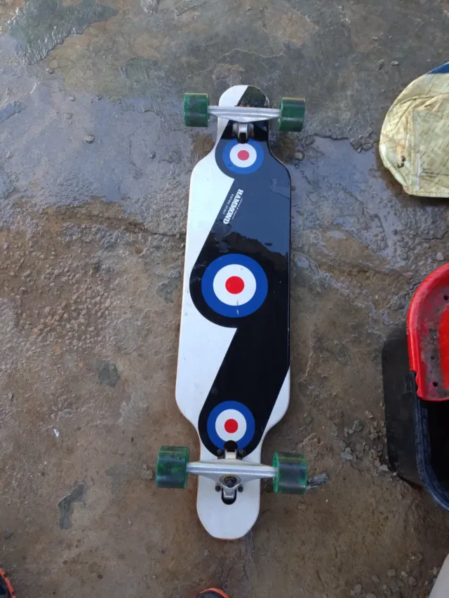 Detalles del productoLongboard con un diseño llamativo en blanco, negro y círculos concéntricos rojos y azules.