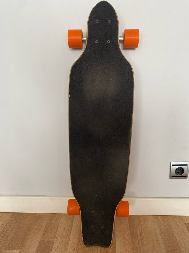 Longboard listo para rodar. - Tabla con lija negra. - Ruedas de color naranja.