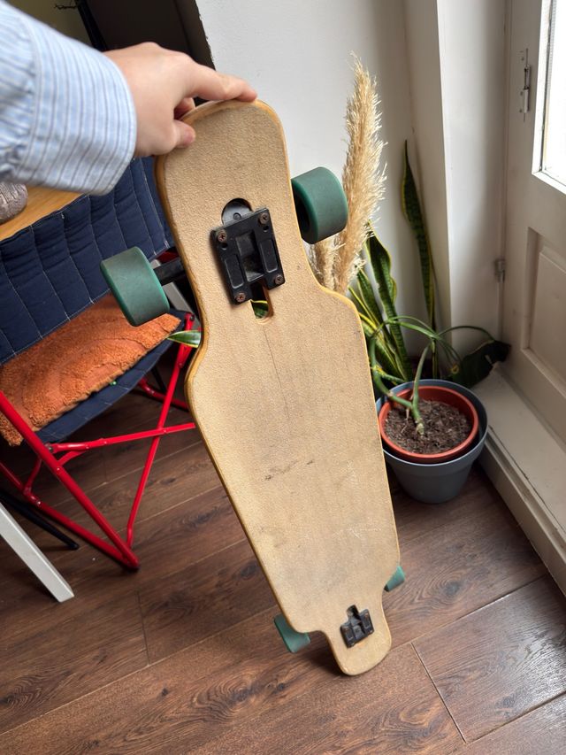 Longboard con cubierta de madera. - Ruedas verdes. - Ejes negros.