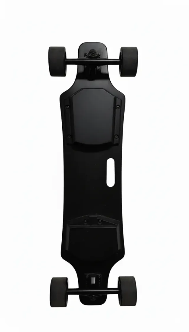 Longboard eléctrico de color negro. Diseño moderno y elegante. - Tabla de longboard. - Ruedas. - Ejes. - cargador - 2 mandos