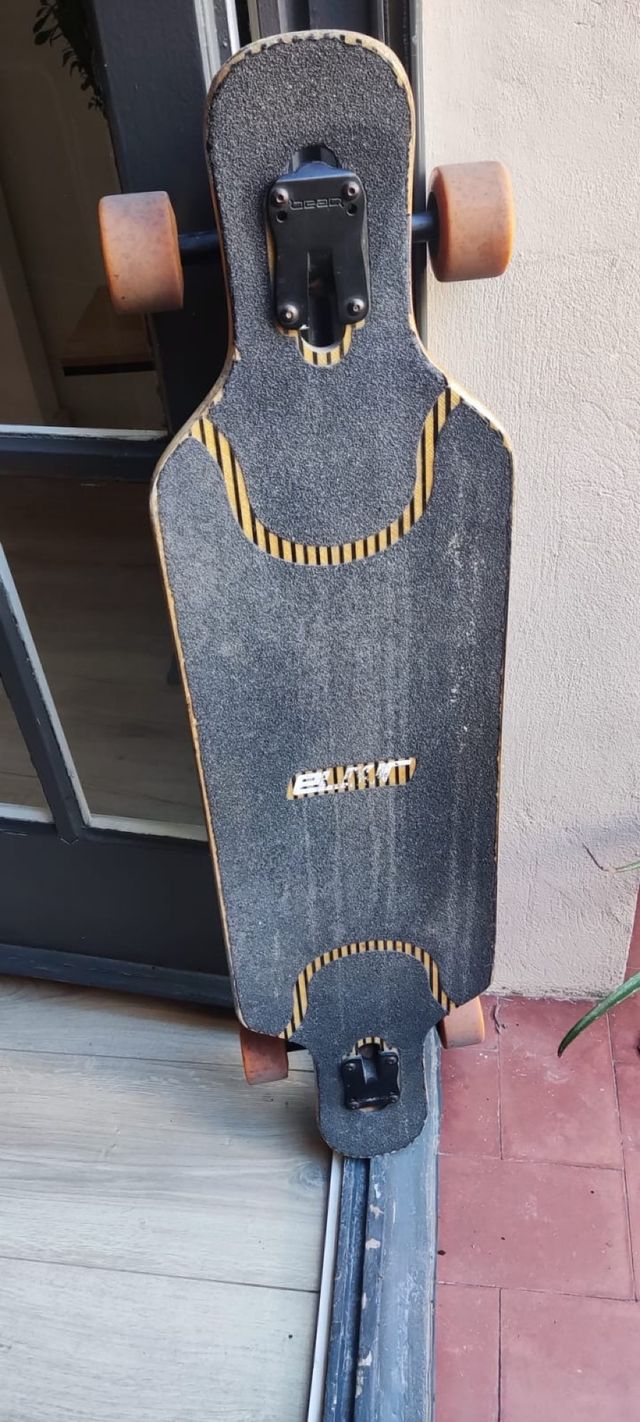 Tabla de longboard de la marca ELIXIR. Diseño con lija negra y detalles en amarillo. - Lija con diseño de rayas amarillas. - Trucks negros. - Ruedas naranjas.