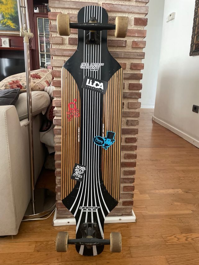 Detalles del productoVendo longboard marca Elixir de 99 cm de longitud. Ideal para freeride y cruising. Tiene varias pegatinas de personalización en la tabla, lo cual le da un toque único.