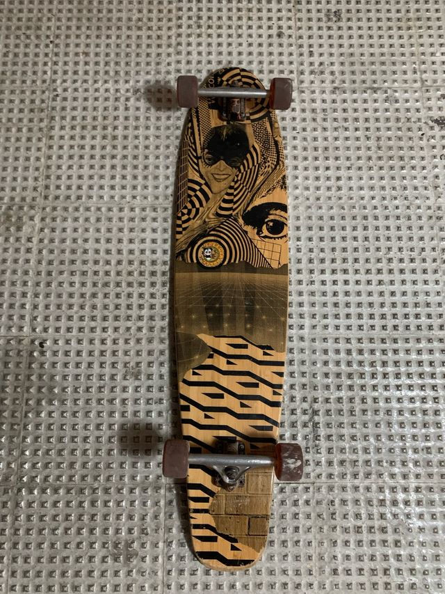 Longboard de la marca Freedom Dolly con un diseño gráfico llamativo. - Tabla con diseño artístico. - Ruedas de color marrón.