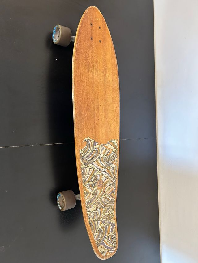 Longboard de la marca Globe con un diseño de olas en la parte inferior. - Tabla de madera con acabado natural.