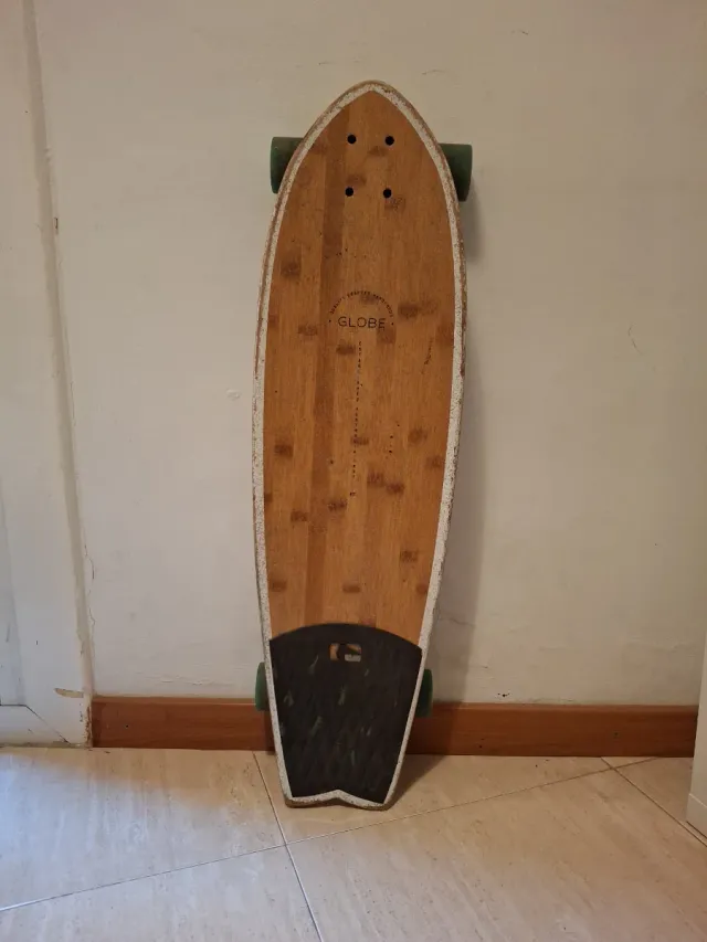 Longboard de la marca Globe - Tabla de bambú - Diseño de longboard - Ruedas verdes