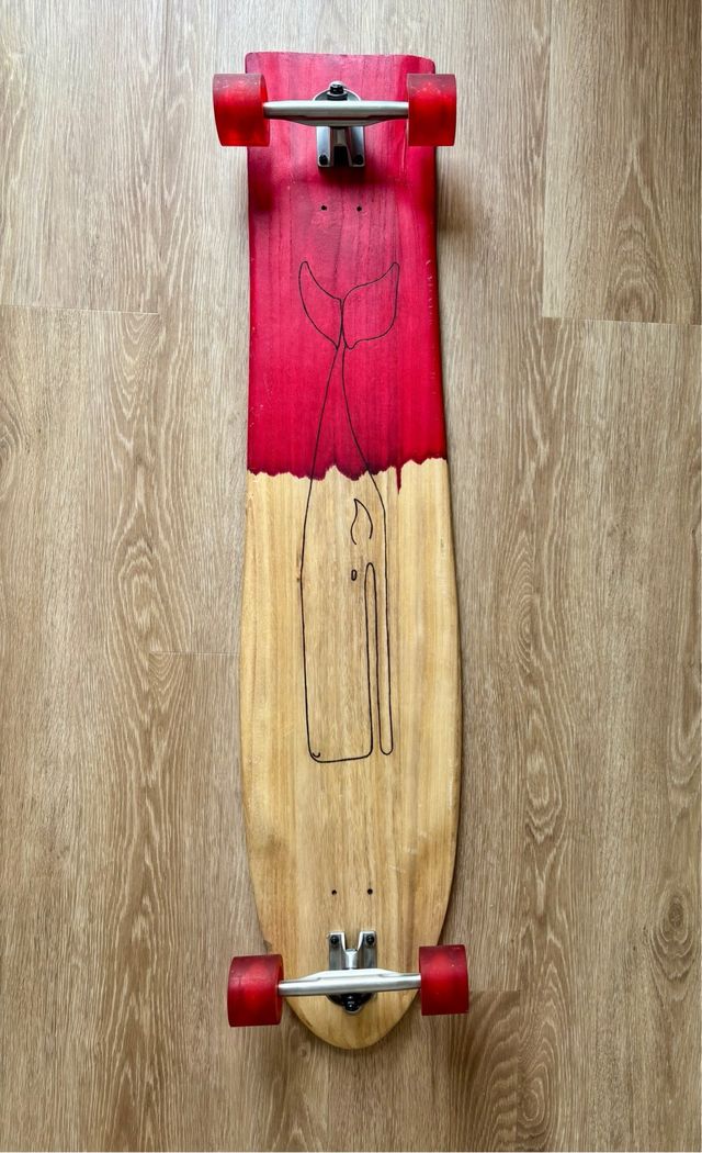 Longboard artesanal con un diseño único. - Parte superior pintada en rojo vibrante. - Dibujo de una vela y cola de ballena. - Ruedas rojas.