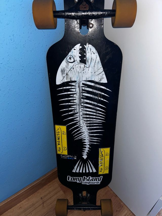 Detalles del productoLongboard de la marca LongIsland con un diseño llamativo de esqueleto de pez.