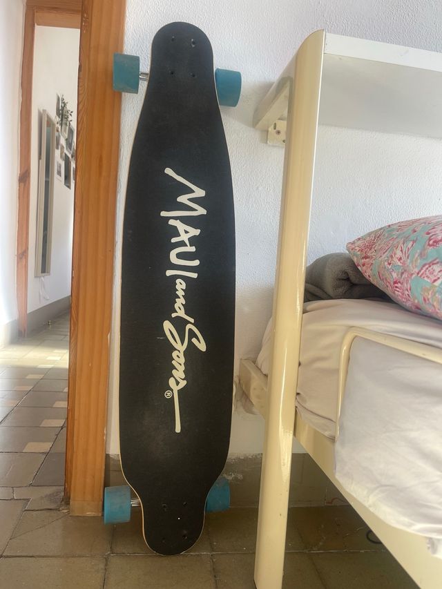 Longboard de la marca Maui & Sons, ideal para desplazamientos y trucos. - Diseño negro con logo blanco. - Ruedas azules. - Tabla larga para mayor estabilidad.