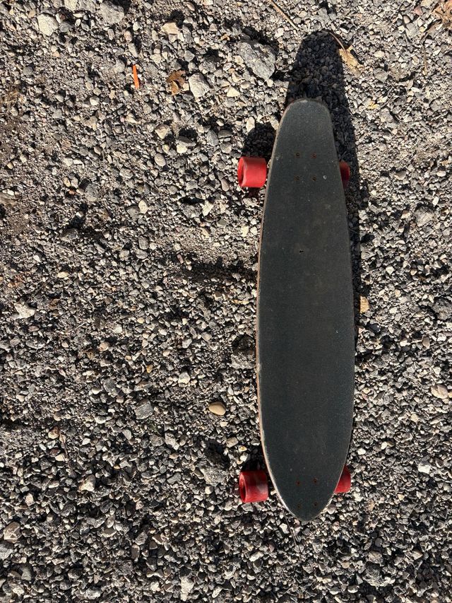 Longboard negro con ruedas rojas. La parte de abajo de la tabla esta en buen estado.