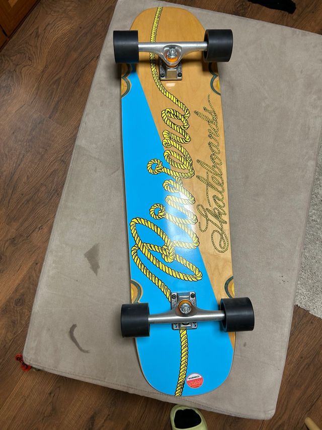 Longboard Riviera con un diseño llamativo de cuerda y fondo azul. - Tabla de madera. - Ruedas negras. - Ejes metálicos.