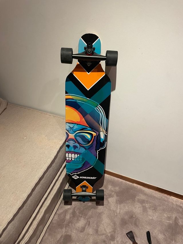 Longboard de la marca Slake con un diseño llamativo. - Usado solo 3 veces. - Ruedas negras. - Gráficos coloridos.
