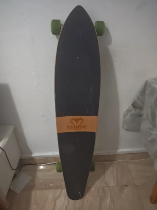 Longboard de la marca Tekny con ruedas verdes. - Tabla con lija negra. - Diseño con banda naranja y logo. - Ruedas de color verde.